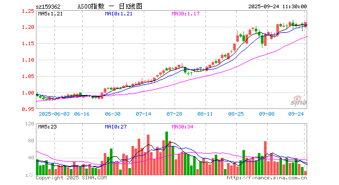 9月24日,截止午间收盘,A500ETF工银(159362)涨0.83%,报1.214元,成交额886.42万元。A500ETF工银(159362)重仓股方面,贵州茅台截止午盘跌0.11%,宁德时代涨1.05%,中国平安涨0.16%,招商银行跌0.53%,兴业银行跌0.73%,长江电力涨0.00%,美的集团涨0.45%,紫金矿业跌0.66%,比亚迪跌0.57%,东方财富涨0.34%。
