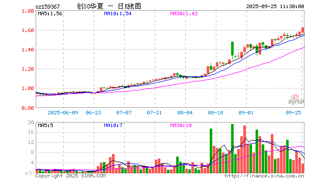 9月25日,截止午间收盘,创业板50ETF华夏(159367)涨2.66%,报1.620元,成交额581.79万元。创业板50ETF华夏(159367)重仓股方面,宁德时代截止午盘涨4.98%,东方财富涨0.98%,汇川技术涨0.79%,中际旭创涨1.12%,迈瑞医疗涨2.69%,新易盛涨5.68%,阳光电源涨3.45%,胜宏科技跌1.25%,亿纬锂能涨7.81%,同花顺涨2.04%。
