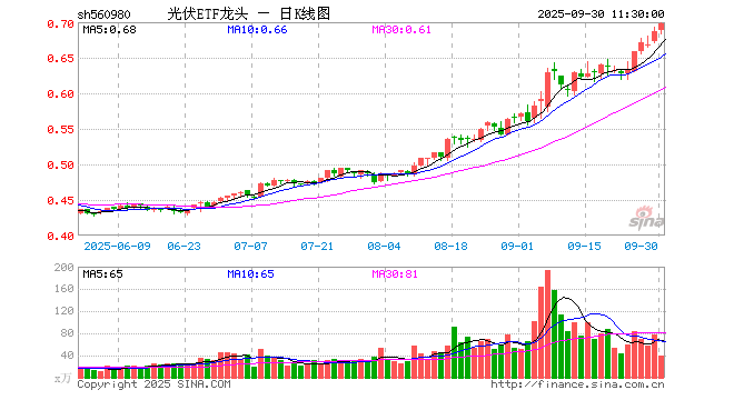 9月30日,截止午间收盘,光伏ETF龙头(560980)涨1.60%,报0.697元,成交额2748.26万元。光伏ETF龙头(560980)重仓股方面,阳光电源截止午盘跌0.07%,TCL科技跌0.46%,特变电工涨4.72%,正泰电器涨1.53%,德业股份涨3.97%,晶盛机电涨1.38%,科华数据跌2.63%,禾望电气涨0.45%,捷佳伟创涨4.91%,锦浪科技涨3.25%。
