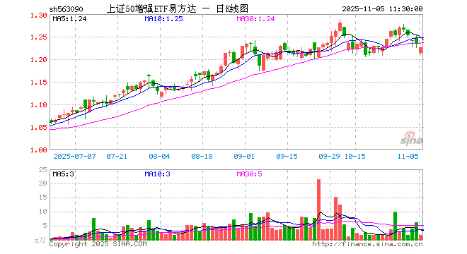 11月5日,截止午间收盘,上证50增强ETF易方达(563090)跌0.57%,报1.226元,成交额200.84万元。上证50增强ETF易方达(563090)重仓股方面,贵州茅台截止午盘跌0.17%,中国平安跌0.48%,药明康德涨1.38%,海尔智家涨0.71%,深南电路跌1.32%,澜起科技跌1.98%,沪电股份跌2.06%,紫金矿业涨0.35%,豪威集团跌0.80%,国泰海通跌0.46%。