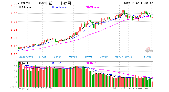 11月5日,截止午间收盘,A500ETF嘉实(159351)跌0.08%,报1.177元,成交额9.88亿元。A500ETF嘉实(159351)重仓股方面,宁德时代截止午盘涨1.10%,贵州茅台跌0.17%,中国平安跌0.48%,招商银行跌0.26%,紫金矿业涨0.35%,新易盛跌1.21%,中际旭创跌1.07%,美的集团涨1.22%,东方财富涨0.20%,长江电力跌0.28%。