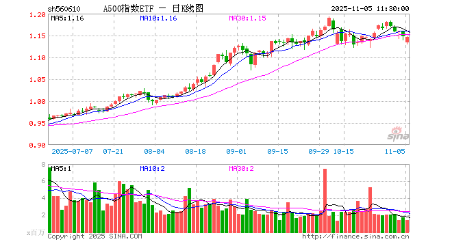 11月5日,截止午间收盘,A500指数ETF(560610)跌0.17%,报1.146元,成交额1.57亿元。A500指数ETF(560610)重仓股方面,宁德时代截止午盘涨1.10%,贵州茅台跌0.17%,中国平安跌0.48%,招商银行跌0.26%,紫金矿业涨0.35%,中际旭创跌1.07%,美的集团涨1.22%,新易盛跌1.21%,东方财富涨0.20%,长江电力跌0.28%。