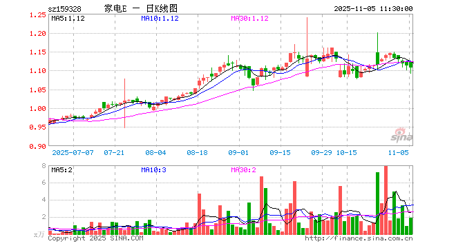 11月5日,截止午间收盘,家电ETF易方达(159328)跌0.63%,报1.106元,成交额209.22万元。家电ETF易方达(159328)重仓股方面,三花智控截止午盘跌1.92%,美的集团涨1.22%,海尔智家涨0.71%,格力电器涨0.23%,石头科技涨1.66%,麦格米特跌2.92%,四川长虹跌0.20%,科沃斯跌1.56%,海信视像跌0.53%,兆驰股份涨1.81%。