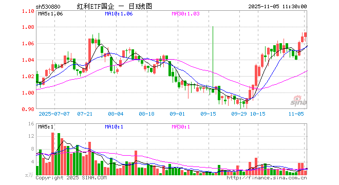 11月5日,截止午间收盘,红利ETF国企(530880)涨0.47%,报1.073元,成交额127.89万元。红利ETF国企(530880)重仓股方面,中远海控截止午盘跌0.13%,潞安环能涨1.82%,农业银行涨0.61%,南钢股份涨0.93%,渝农商行涨0.28%,大秦铁路跌0.52%,山煤国际涨0.97%,中国神华涨0.67%,工商银行涨0.49%,江苏金租涨0.65%。