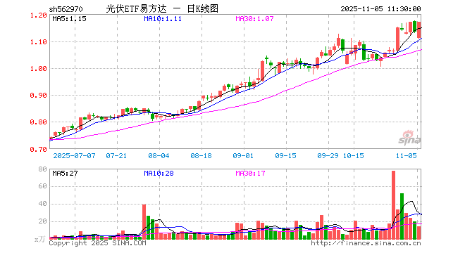 11月5日,截止午间收盘,光伏ETF易方达(562970)涨3.09%,报1.169元,成交额1618.20万元。光伏ETF易方达(562970)重仓股方面,阳光电源截止午盘涨3.75%,隆基绿能涨1.55%,特变电工涨9.99%,TCL科技涨0.47%,通威股份跌0.33%,正泰电器涨2.78%,晶盛机电涨1.00%,TCL中环涨1.37%,德业股份涨2.34%,捷佳伟创跌0.13%。