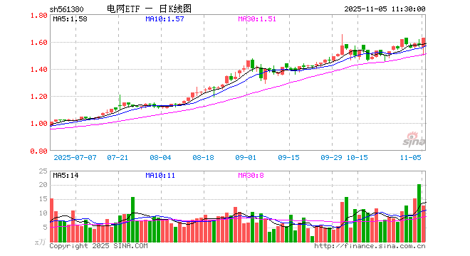 11月5日,截止午间收盘,电网ETF(561380)涨3.05%,报1.623元,成交额2032.59万元。电网ETF(561380)重仓股方面,新易盛截止午盘跌1.21%,国电南瑞涨2.32%,特变电工涨9.99%,思源电气涨2.11%,中天科技跌0.24%,亨通光电涨0.28%,东方电缆涨2.40%,宏发股份涨10.00%,浙江荣泰涨3.56%,特锐德涨2.91%。