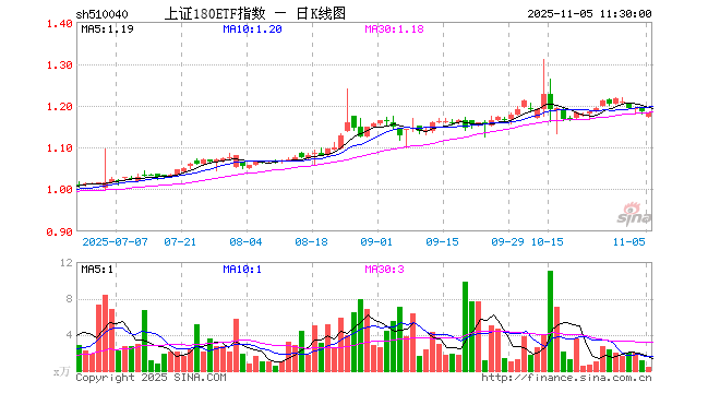 11月5日,截止午间收盘,上证180ETF指数(510040)跌0.25%,报1.182元,成交额49.66万元。上证180ETF指数(510040)重仓股方面,贵州茅台截止午盘跌0.17%,紫金矿业涨0.35%,恒瑞医药涨0.29%,寒武纪跌1.01%,药明康德涨1.38%,中国平安跌0.48%,中芯国际跌1.04%,工业富联跌1.35%,招商银行跌0.26%,海光信息跌2.10%。