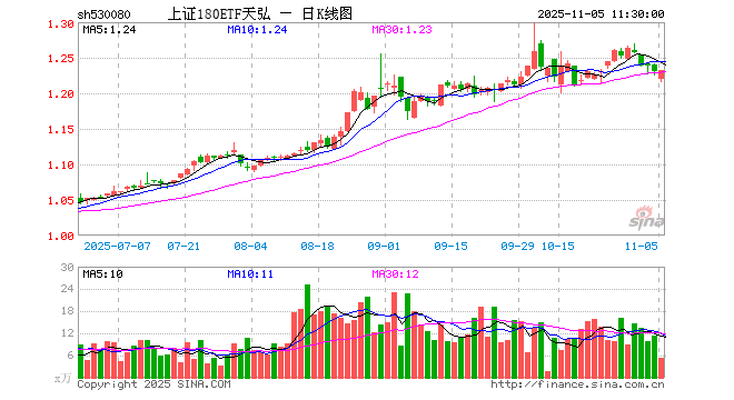 11月5日,截止午间收盘,上证180ETF天弘(530080)涨0.08%,报1.232元,成交额666.26万元。上证180ETF天弘(530080)重仓股方面,贵州茅台截止午盘跌0.17%,紫金矿业涨0.35%,恒瑞医药涨0.29%,药明康德涨1.38%,寒武纪跌1.01%,中国平安跌0.48%,中芯国际跌1.04%,工业富联跌1.35%,招商银行跌0.26%,海光信息跌2.10%。