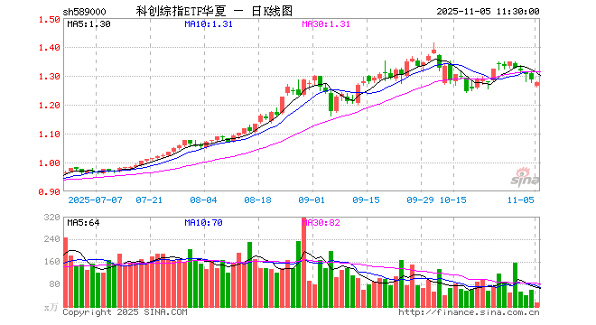 11月5日,截止午间收盘,科创综指ETF华夏(589000)跌0.62%,报1.277元,成交额2007.18万元。科创综指ETF华夏(589000)重仓股方面,海光信息截止午盘跌2.10%,寒武纪跌1.01%,中芯国际跌1.04%,中微公司涨1.22%,澜起科技跌1.98%,百利天恒跌0.85%,金山办公跌1.95%,联影医疗涨1.50%,影石创新跌3.50%,传音控股跌3.53%。
