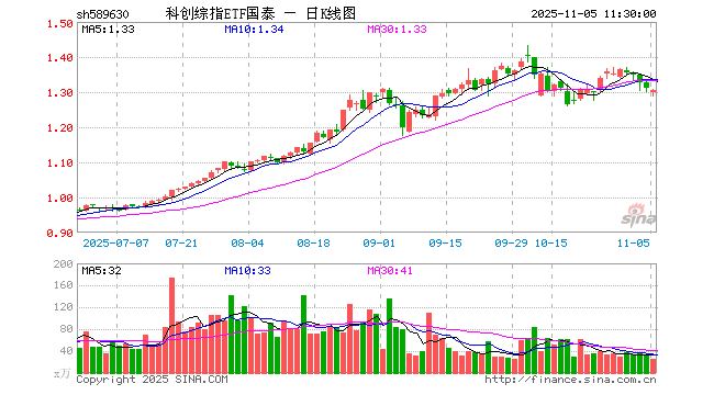 11月5日,截止午间收盘,科创综指ETF国泰(589630)跌0.53%,报1.304元,成交额3207.13万元。科创综指ETF国泰(589630)重仓股方面,海光信息截止午盘跌2.10%,寒武纪跌1.01%,中芯国际跌1.04%,澜起科技跌1.98%,金山办公跌1.95%,中微公司涨1.22%,联影医疗涨1.50%,百利天恒跌0.85%,传音控股跌3.53%,影石创新跌3.50%。