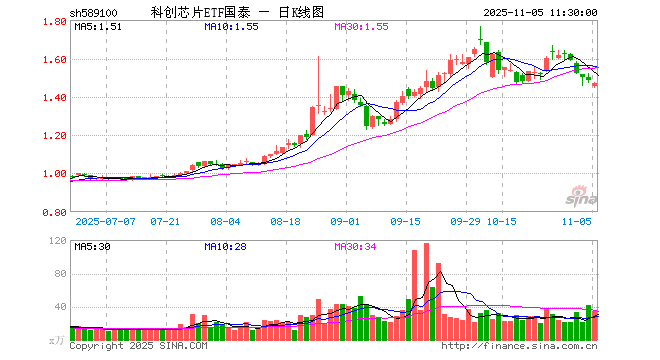 11月5日,截止午间收盘,科创芯片ETF国泰(589100)跌1.08%,报1.470元,成交额4985.44万元。科创芯片ETF国泰(589100)重仓股方面,海光信息截止午盘跌2.10%,澜起科技跌1.98%,中芯国际跌1.04%,寒武纪跌1.01%,中微公司涨1.22%,芯原股份跌1.57%,华虹公司跌1.06%,沪硅产业跌1.22%,华海清科跌1.20%,晶晨股份跌0.52%。