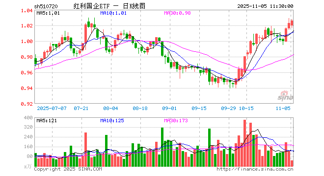 11月5日,截止午间收盘,红利国企ETF(510720)涨0.29%,报1.026元,成交额4946.18万元。红利国企ETF(510720)重仓股方面,中远海控截止午盘跌0.13%,潞安环能涨1.82%,农业银行涨0.61%,南钢股份涨0.93%,渝农商行涨0.28%,大秦铁路跌0.52%,山煤国际涨0.97%,中国神华涨0.67%,工商银行涨0.49%,江苏金租涨0.65%。
