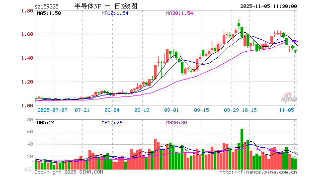 11月5日,截止午间收盘,半导体ETF南方(159325)跌1.49%,报1.458元,成交额2398.78万元。半导体ETF南方(159325)重仓股方面,中芯国际截止午盘跌1.04%,寒武纪跌1.01%,海光信息跌2.10%,北方华创跌1.86%,澜起科技跌1.98%,兆易创新跌3.77%,中微公司涨1.22%,豪威集团跌0.80%,长电科技跌2.24%,紫光国微跌1.82%。