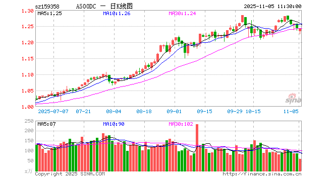 11月5日,截止午间收盘,中证A500ETF基金(159358)跌0.08%,报1.242元,成交额7304.26万元。中证A500ETF基金(159358)重仓股方面,宁德时代截止午盘涨1.10%,贵州茅台跌0.17%,中国平安跌0.48%,招商银行跌0.26%,紫金矿业涨0.35%,新易盛跌1.21%,中际旭创跌1.07%,美的集团涨1.22%,东方财富涨0.20%,长江电力跌0.28%。