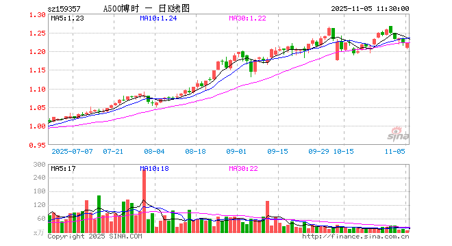 11月5日,截止午间收盘,中证A500指数ETF(159357)跌0.16%,报1.221元,成交额830.60万元。中证A500指数ETF(159357)重仓股方面,宁德时代截止午盘涨1.10%,贵州茅台跌0.17%,中国平安跌0.48%,招商银行跌0.26%,紫金矿业涨0.35%,中际旭创跌1.07%,美的集团涨1.22%,新易盛跌1.21%,东方财富涨0.20%,长江电力跌0.28%。