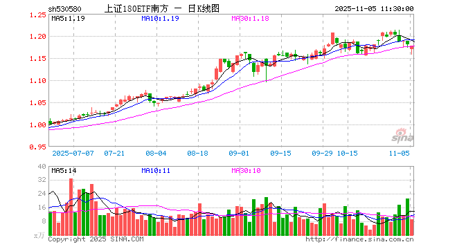 11月5日,截止午间收盘,上证180ETF南方(530580)跌0.17%,报1.178元,成交额1054.35万元。上证180ETF南方(530580)重仓股方面,贵州茅台截止午盘跌0.17%,紫金矿业涨0.35%,恒瑞医药涨0.29%,药明康德涨1.38%,中国平安跌0.48%,寒武纪跌1.01%,中芯国际跌1.04%,工业富联跌1.35%,招商银行跌0.26%,海光信息跌2.10%。