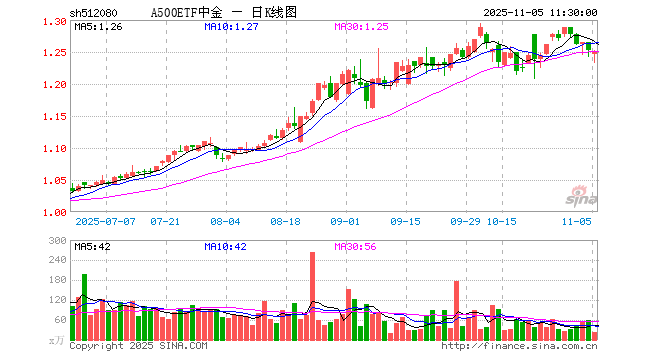 11月5日,截止午间收盘,A500ETF中金(512080)跌0.08%,报1.251元,成交额2818.04万元。A500ETF中金(512080)重仓股方面,宁德时代截止午盘涨1.10%,贵州茅台跌0.17%,中国平安跌0.48%,招商银行跌0.26%,紫金矿业涨0.35%,美的集团涨1.22%,新易盛跌1.21%,中际旭创跌1.07%,东方财富涨0.20%,长江电力跌0.28%。
