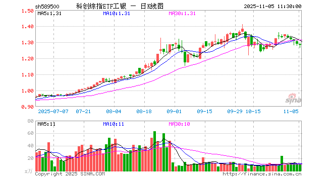 11月5日,截止午间收盘,科创综指ETF工银(589500)跌0.54%,报1.283元,成交额1289.61万元。科创综指ETF工银(589500)重仓股方面,海光信息截止午盘跌2.10%,寒武纪跌1.01%,中芯国际跌1.04%,中微公司涨1.22%,澜起科技跌1.98%,百利天恒跌0.85%,金山办公跌1.95%,联影医疗涨1.50%,影石创新跌3.50%,传音控股跌3.53%。