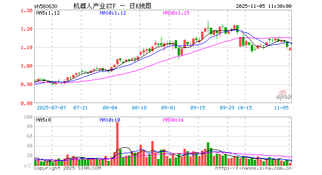 11月5日,截止午间收盘,机器人产业ETF(560630)跌0.91%,报1.092元,成交额497.05万元。机器人产业ETF(560630)重仓股方面,汇川技术截止午盘跌0.08%,科大讯飞跌2.55%,石头科技涨1.66%,大华股份跌1.04%,中控技术跌0.77%,大族激光跌1.66%,双环传动跌1.42%,科沃斯跌1.56%,机器人跌0.49%,云天励飞跌1.57%。