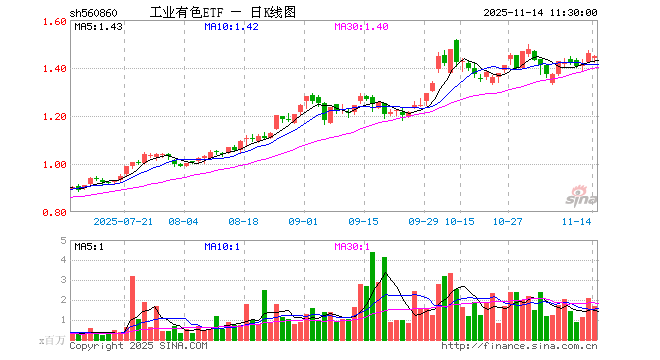 11月14日,截止午间收盘,工业有色ETF(560860)跌0.69%,报1.449元,成交额2.42亿元。工业有色ETF(560860)重仓股方面,北方稀土截止午盘跌0.19%,洛阳钼业涨0.36%,中国铝业跌2.63%,华友钴业跌1.13%,云铝股份跌2.36%,铜陵有色跌0.93%,兴业银锡跌0.84%,中国稀土涨0.32%,江西铜业跌2.03%,西部矿业跌0.90%。