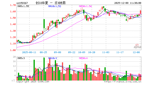 12月8日,截止午间收盘,创业板50ETF华夏(159367)涨3.47%,报1.611元,成交额779.12万元。创业板50ETF华夏(159367)重仓股方面,宁德时代截止午盘涨0.79%,中际旭创涨8.10%,东方财富涨2.02%,新易盛涨9.40%,阳光电源涨3.24%,胜宏科技涨6.82%,汇川技术涨0.37%,迈瑞医疗跌0.12%,亿纬锂能涨3.91%,同花顺涨0.43%。
