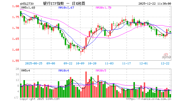 12月22日,截止午间收盘,银行ETF指数(512730)跌0.59%,报1.679元,成交额340.77万元。银行ETF指数(512730)重仓股方面,招商银行截止午盘跌0.17%,兴业银行跌0.24%,工商银行跌0.25%,农业银行涨0.40%,交通银行跌0.40%,江苏银行跌0.86%,浦发银行跌0.17%,平安银行跌0.52%,民生银行跌0.26%,上海银行跌1.40%。