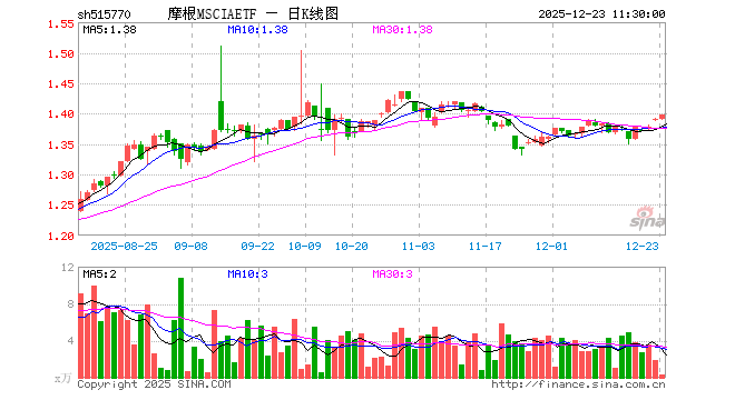 12月23日,截止午间收盘,摩根MSCIAETF(515770)涨0.58%,报1.398元,成交额38.88万元。摩根MSCIAETF(515770)重仓股方面,贵州茅台截止午盘跌0.02%,宁德时代涨1.93%,工业富联涨4.11%,招商银行涨0.31%,寒武纪涨2.66%,长江电力涨0.40%,紫金矿业涨0.61%,比亚迪涨0.79%,中国平安涨1.78%,海光信息涨2.35%。