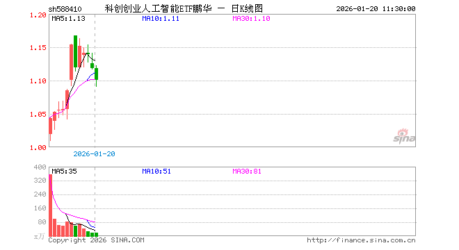 1月20日,截止午间收盘,科创创业人工智能ETF鹏华(588410)跌1.61%,报1.100元,成交额1947.81万元。科创创业人工智能ETF鹏华(588410)重仓股方面,中际旭创截止午盘跌3.92%,新易盛跌6.12%,澜起科技涨4.79%,寒武纪跌3.93%,金山办公跌2.14%,芯原股份跌1.53%,润泽科技跌0.10%,北京君正涨3.39%,昆仑万维跌1.82%,协创数据跌1.38%。