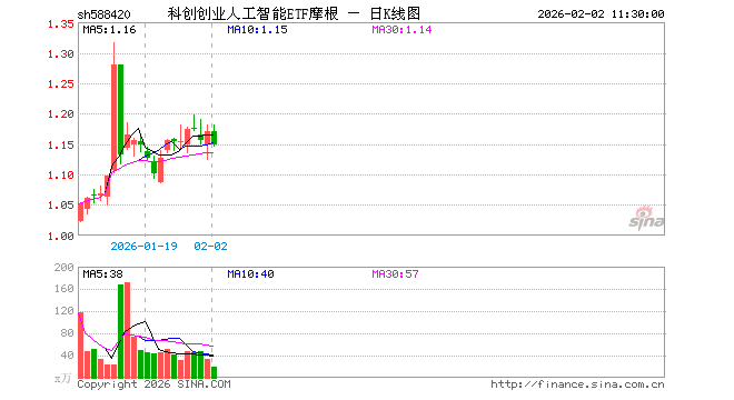 2月2日,截止午间收盘,科创创业人工智能ETF摩根(588420)跌1.88%,报1.149元,成交额2296.40万元。科创创业人工智能ETF摩根(588420)重仓股方面,寒武纪截止午盘涨0.56%,澜起科技跌1.36%,新易盛涨4.89%,中际旭创跌7.24%,金山办公跌2.74%,芯原股份跌4.00%,润泽科技涨6.39%,北京君正跌9.39%,昆仑万维跌2.89%,协创数据跌5.19%。
