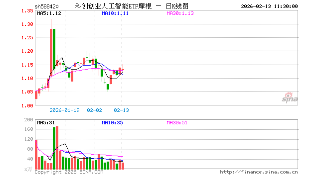 2月13日,截止午间收盘,科创创业人工智能ETF摩根(588420)跌0.35%,报1.133元,成交额2764.04万元。科创创业人工智能ETF摩根(588420)重仓股方面,寒武纪截止午盘涨0.58%,澜起科技跌1.36%,新易盛跌0.48%,中际旭创跌0.51%,金山办公跌1.77%,芯原股份涨1.99%,北京君正跌0.60%,昆仑万维跌2.46%,协创数据跌1.78%。