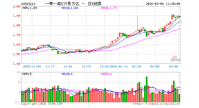 3月6日,截止午间收盘,一带一路ETF易方达(515110)跌0.47%,报1.886元,成交额593.84万元。一带一路ETF易方达(515110)重仓股方面,小商品城截止午盘涨0.14%,金风科技涨2.61%,中国铝业跌4.53%,烽火通信跌4.53%,东阿阿胶跌0.15%,南网能源跌2.34%,广东宏大涨3.93%,云铝股份跌4.57%,建设银行涨0.00%,中国联通跌0.40%。