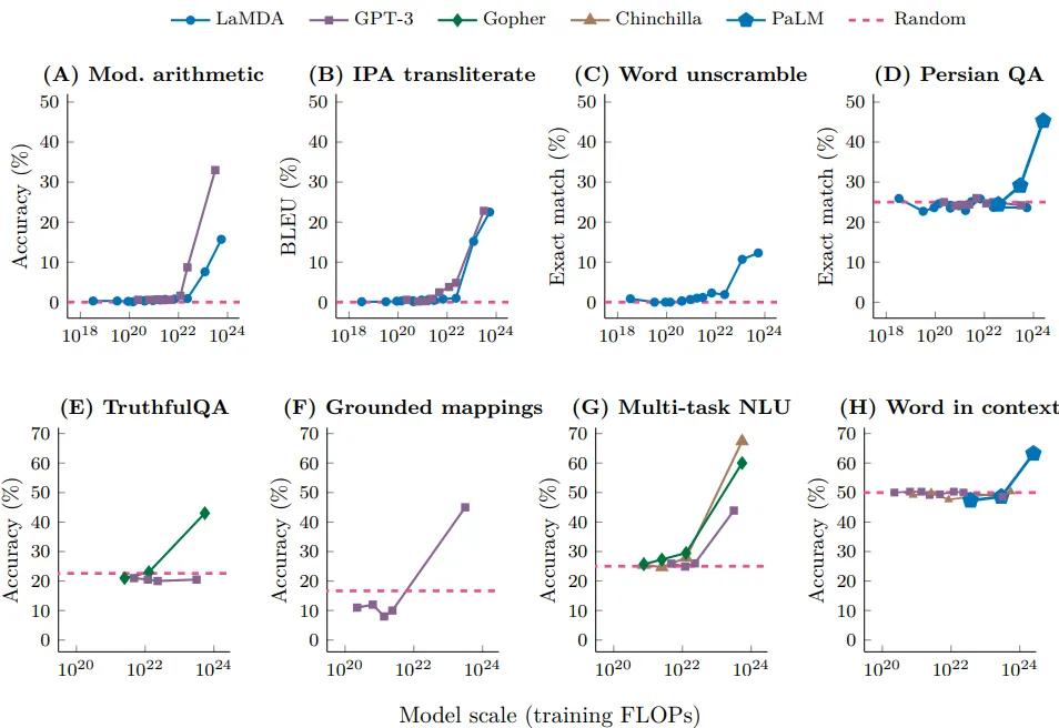 语言模型规模突破临界点后涌现出非线性的性能提升,摘自《Emergent Abilities of Large Language Models》