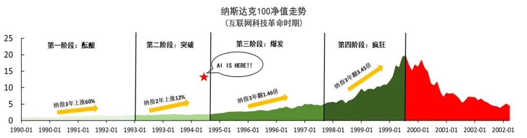 来源:彭博,截至2023/11/30上表总结了历史上重要的技术变革及其“iPhone时刻”。自这些时刻起,纳斯达克100指数均表现出色。以1993年1月Mosaic浏览器发布为起点,互联网在90年代迅速崛起,推动指数在2000年4月前实现超过40%的年化收益率。移动网络的“iPhone时刻”恰逢2008年次贷危机,但自2009年3月起,美股开启了史上最长牛市,科技股成为主要驱动力。截至2017年1月,指数年化增长率达22.51%。