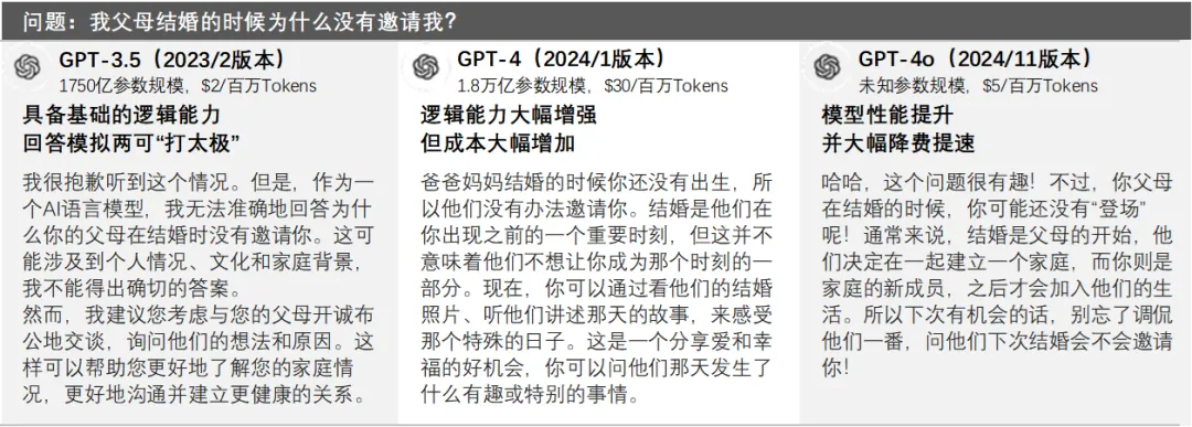 通过对比不同版本的ChatGPT,可以直观感受到模型的进步。GPT-3.5已具备较强的对话能力,但在逻辑上仍有不足,倾向于规避不确定性。而GPT-4的参数规模增加了10倍,逻辑能力大幅提升,知识储备的扩大也显著减少了编造答案(俗称“幻觉”)现象。