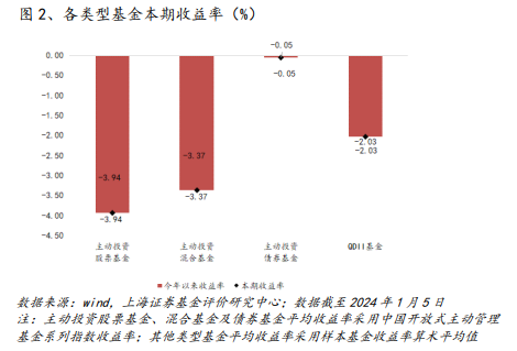 本 期 ( 2024.1.2-1.5 ) 上 证 指 数 下 跌 1.54% , 深 证 指 数 下 跌4.29%。申万一级行业多数下跌,其中煤炭行业涨幅最大。海外权益市场重要指数多数下跌,国际黄金价格下跌。本期各类型基金指数都录得负收益。主动投资债券基金指数下跌 0.05%,主动投资混合基金指数下跌 3.37%,主动投资股票基金指数下跌 3.94%;QDII 基金收益率平均数下跌 2.03%。