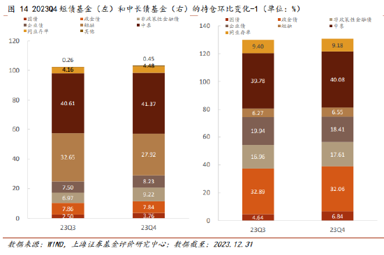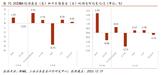 具体券种配置及占比变化方面,短债基金短融仓位中位数下降4.73%,,或因四季度高等级中短期票据期限利差收窄。同时短债基金较大幅度增配非政策性金融债。截止四季末,短债基金以持有中票和短融为主,仓位中位数分别为 41.37%和 27.92%。中长债基金国债仓位上升 2.2%,或因四季度长端利率债收益率下行幅度较大有关。同时,企业债和政金债仓位分别下降 1.53%和 0.83%。