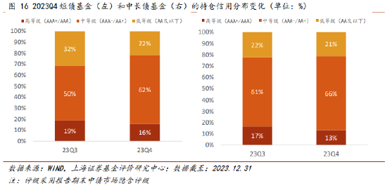 四季度,短债基金和中长债基金总体都加配了中等级信用债。短债基金的信用下沉有所改善,低等级信用债仓位从 32%下降至 22%,中等级信用债仓位从 50%上升至 62%。中长债基金信用下沉加剧,高等级信用债仓位从 17%下降至 13%,中等级信用债的仓位由 61%上升至 66%。