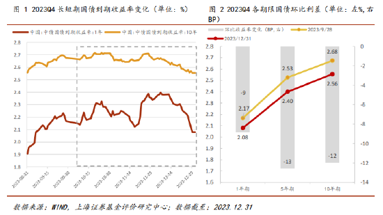 截至四季度末,1 年期国债到期收益率较上季末下行 9BP 至2.08%,10 年国债到期收益率较上季末下行 12BP 至 2.56%。总体长端下行幅度更大,期限利差收窄。
