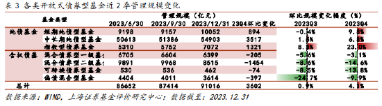基金数量:四季度,开放式债券型基金的存续数量较上季增加93只至4199只。除偏债混合型基金较上季度数量下降及可转债基金数量较上季度持平外,其余各类型债基的数量均有增长。其中,中长期纯债基金的增量和指数型债券基金的增速较为突出。