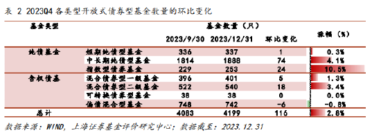 截至 2023 年四季度,开放式债券型基金的存续数量较上季度的4083 只增加 93 只至 4199 只(多份额基金视为一只基金,下同),增幅为 2.8%。
