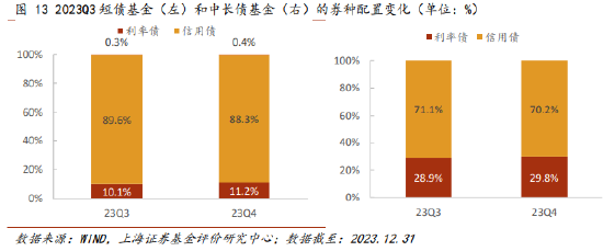 总体而言,短债基金的信用债持仓占比较高,约占 9 成;中长债基金占约 7 成。