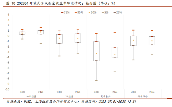 本季债券收益率曲线呈牛平走势,股市低迷,纯债基金与一级债基的收益率中位数为正,且各分位数的收益率较三季度多有提升(仅一级债基后 5%分位的收益率较环比下跌);含权比例较高的二级债基、转债基金和偏债混合基金的收益率中位数均为负且较三季度均下跌,但收益率的内部分化有所收敛。