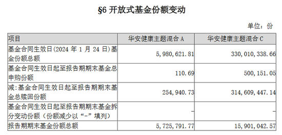 根据基金一季报,截至2024年3月31日末,华安健康主题混合基金份额仅剩余2162.68万份,基金资产净值剩余2160.53万元,与基金成立时相比资产缩水了3亿多。其中,华安健康主题混合C份额在一季度被赎回高达3.15亿份,申购仅50万份左右,净赎回份额达3亿多份。