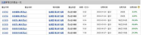 不过来到华安基金后,刘潇管理的基金产品任职回报都是亏损的。数据显示,刘潇管理华安医疗创新混合2年多时间,任职回报亏损超20%;刘潇管理华安匠心臻选混合1年多时间,任职回报亏损超过18%,管理华安健康主题混合任职回报也是亏损的。