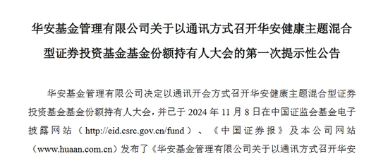 11月11日,华安基金发布了关于华安健康主题混合基金召开基金份额持有人会议的第一次提示公告,公告内容显示,华安健康主题混合此次召开基金份额持有人会议,审议《关于华安健康主题混合型证券投资基金持续运作有关事项的议案》,基金份额持有人会议投票时间为11月13日至12月8日。