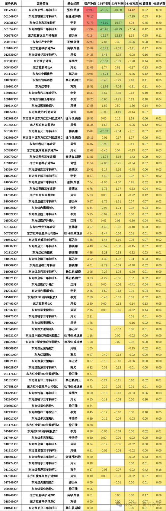 统计wind数据发现,东方红资管三年期产品22年和23年几乎全部大幅亏损,启东三年22年一年亏损43亿,启恒三年一年亏损26亿;23年东方红睿泽一年亏损超20亿。毫无疑问,基本在这三年亏惨了。