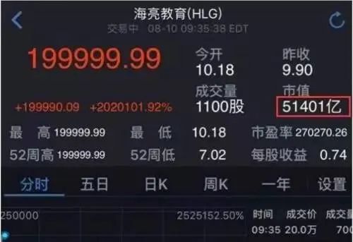 2017年8月10日,在美股上市的海亮教育以10.18美元/股的价格开盘,9点30分最后一笔交易为10.25美元,成交了400股。然而在9时35分,神奇的一幕出现了。随着一笔700股的单子成交,海亮教育股价飙升到199999.99美元,涨幅为2020101.92%,也就是说超过了2万倍。