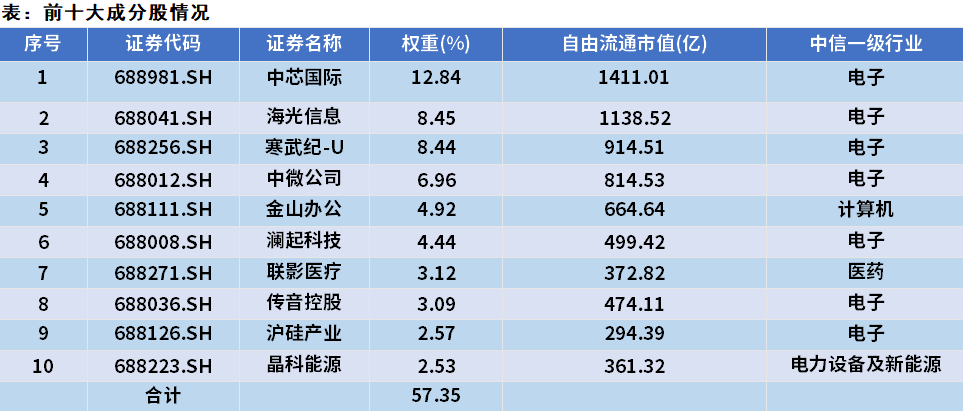行业分布来看,电子、计算机行业占比72%,硬科技行业占比高。成分股中汇聚包括中芯国际、中微公司等在内的半导体、云服务、消费电子等硬科技行业龙头。