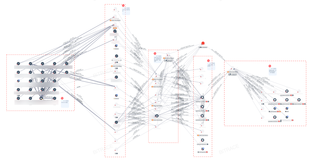 对洗钱车队的佣金地址TGeZzC进行拓展分析发现,此案仅是庞大洗钱网络的冰山一角。追溯资金来源可发现7个同层级的一级收款地址,均从香港兑换商铺接收不同金额的USDT,按固定比例分配后通过担保平台完成资金转移,显示出高度专业化的分工特征。