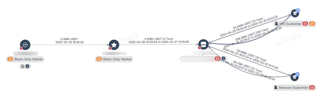 对收款地址TTb8Fk的资金流向分析显示,该学生通过指定兑换商铺购入的2396枚USDT最终流向了担保平台商户地址TKN5Vg。该地址长期与东南亚地区的汇旺担保(HuioneGuarantee)和新币担保(NewcoinGuarantee)保持业务往来。